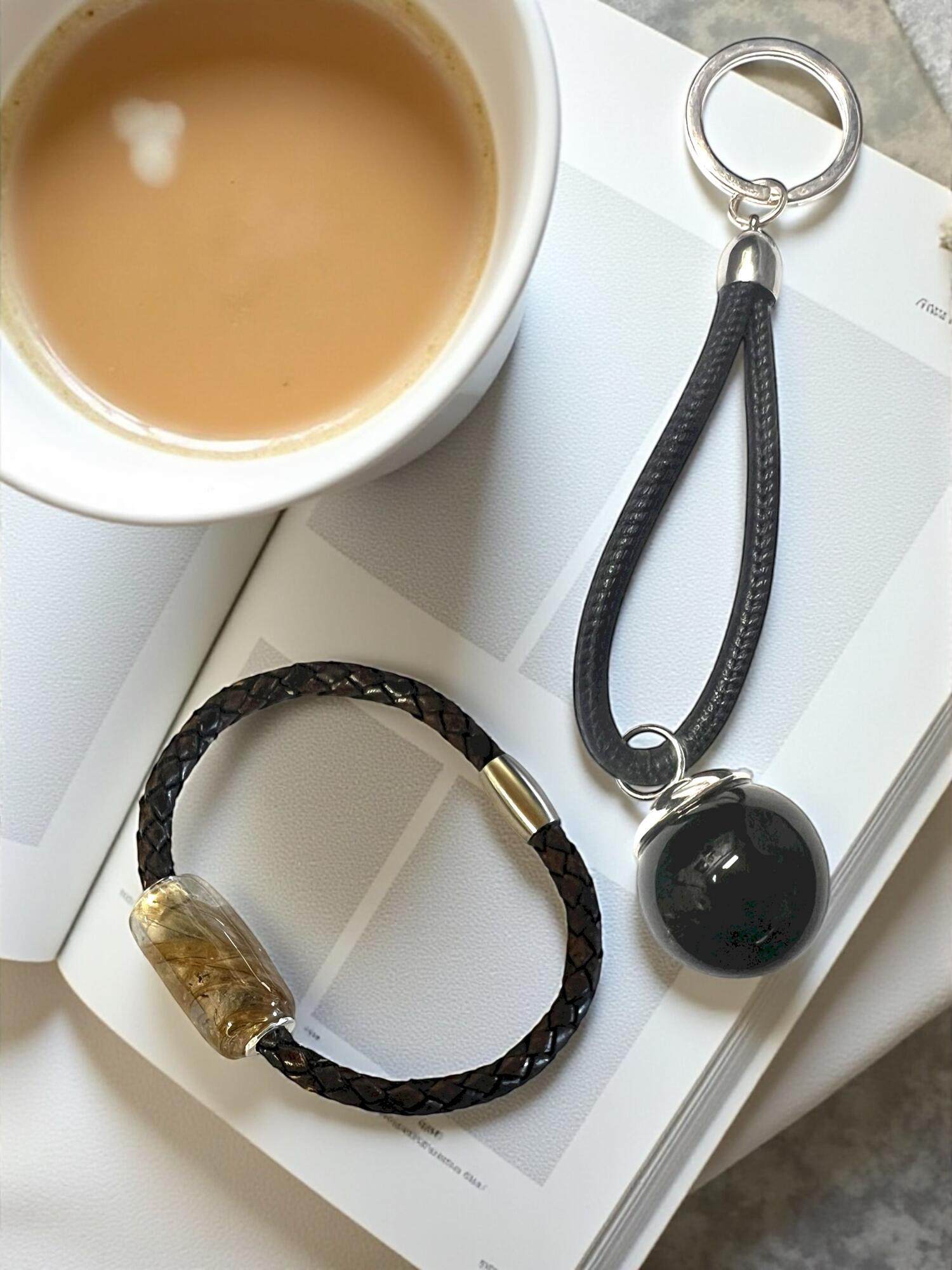 Læder armbånd med aflang perle der kan indeholde pels,  perlens ender er sølv indsatser